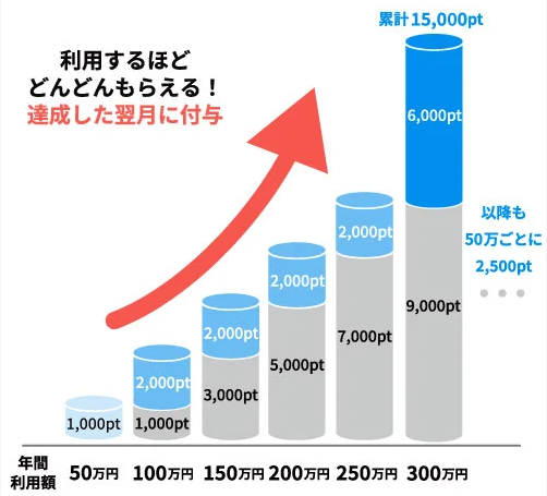 当年の利用金額50万円(税込)ごとに、通常ポイントとは別で、達成した翌月にポイントを進呈される特典です。