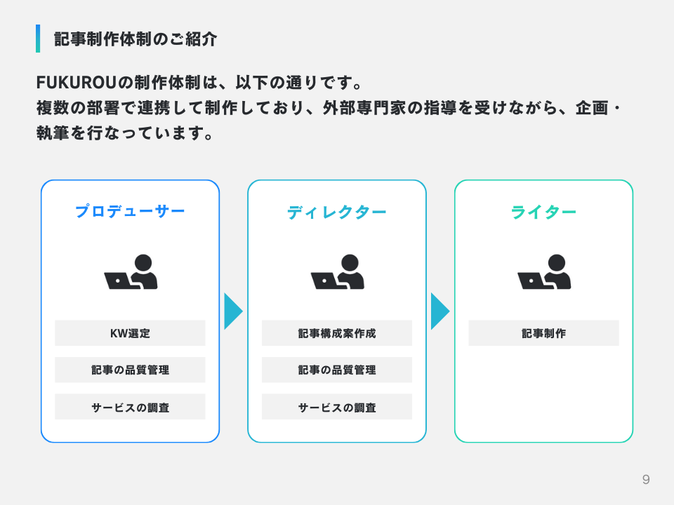 制作チームは、プロデューサー(KW選定・記事の品質管理) 、ディレクター(サービスの調査・記事構成案作成) 、ライター(記事執筆) という明確な分業体制を敷き、一人ひとりがコンテンツ品質に責任を持っています。